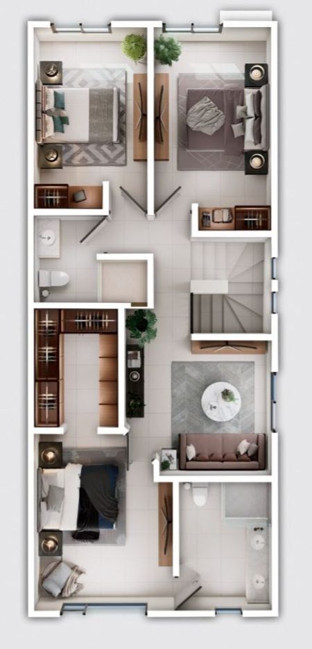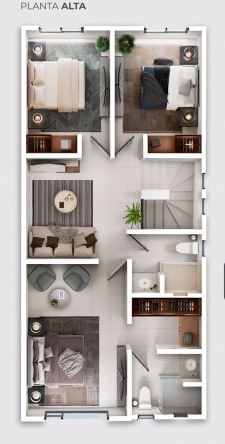 En planta alta: 1 recamara principal con vestidor y un baño completo, 2 recamaras con espacio para closet, 1 baño compartido y estancia.