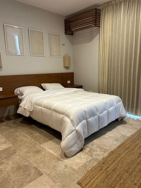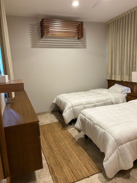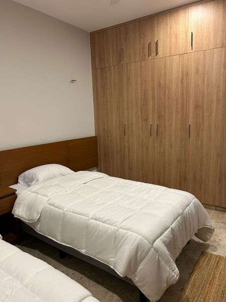 *3 recámaras: la principal con clóset, cama queen, TV y baño completo. Dos recámaras secundarias, cada una con clóset y 2 camas individuales (comparten baño completo).