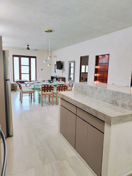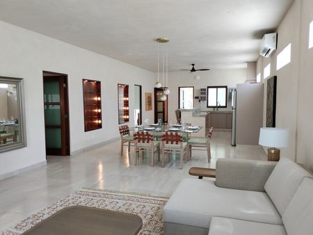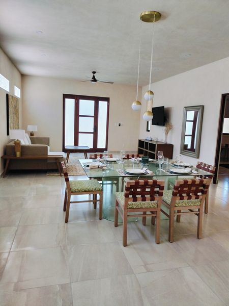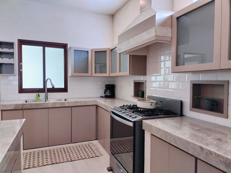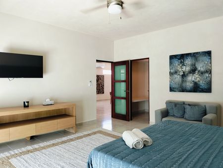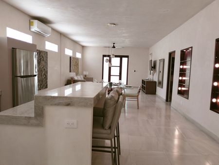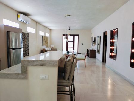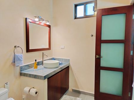 Cuenta con baño de visitas y aarea de lavandería, el departamento tiene acceso directo a calle mediante garaje con portón eléctrico para dos autos y pórtico de entrada, así también tiene acceso directo a una hermosa y amplia alberca y área de estar con camastros la cual es compartida con los demás departamentos