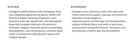 • Cocina totalmente equipada con las mejores marcas del mercado, gabinetes europeos y cubiertas de cuarzo, cuidando que todos los detalles se integren al mejor lujo de cada residencia.