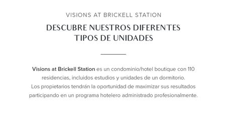 Te presentamos un desarrollo en la creciente zona de Brickell, inigualable ubicación, consta de sólo 110 exclusivas unidades, totalmente equipadas, entrega llave en mano, con Wellness Components, con todos los servicios, seguridad 24/7 y administración Condo-Hotelera, para que no tengas que molestarte por nada, nos ocuparemos de poner a trabajar al máximo tu Inversión.