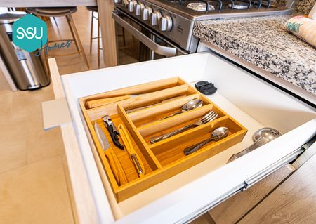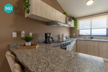Cocina integral con barra de granito, área de lavado oculto, sala comedor y terraza con vistas.