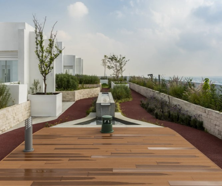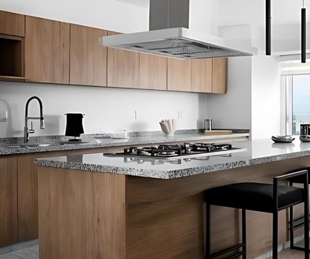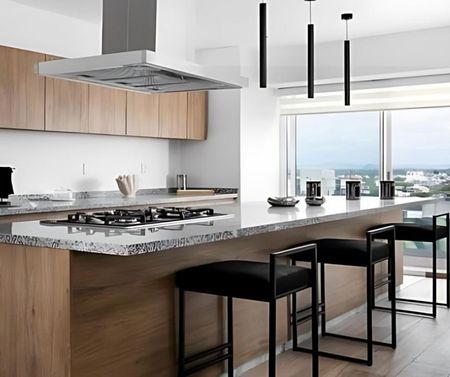 Acabados de alta calidad como: mármol en baños y cocinas, madera de ingeniería y barra de cuarzo.