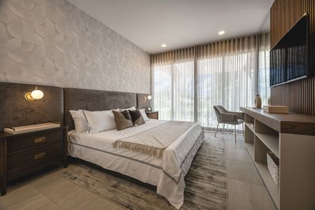 Departamento en venta con especulares amenidades, 3 albercas, cancha de pádel, gimnasio, centro de negocios, cuarto de juegos, integrando exitosamente jardines, espejos de agua, piscinas, casa de árbol y área habitable.