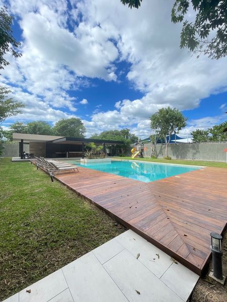 Amplia area comun con piscina muy grande, juegos, mesas y baños.