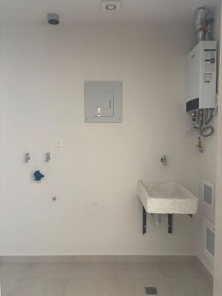 Cocina con cubierta de cuarzo blanco, sala comedor con aire acondicionado, área de lavado y cochera para dos autos.