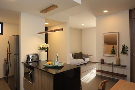 2 recamaras, principal con baño completo, sala-comedor, cocina equipada, área de lavado, estacionamiento con elevador (camioneta y auto).