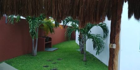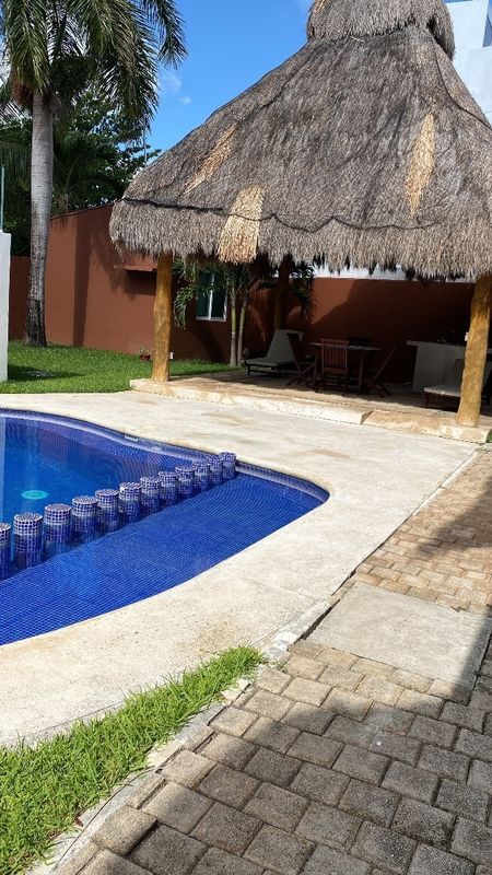 terraza, estancia con cocina integral, sala comedor, Cuarto de lavado, jardín con alberca y Palapa. Un lugar de estacionamiento.