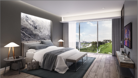 Recámara principal con elegante baño privado, amplio walk-in closet y vistas panorámicas al campo de golf.