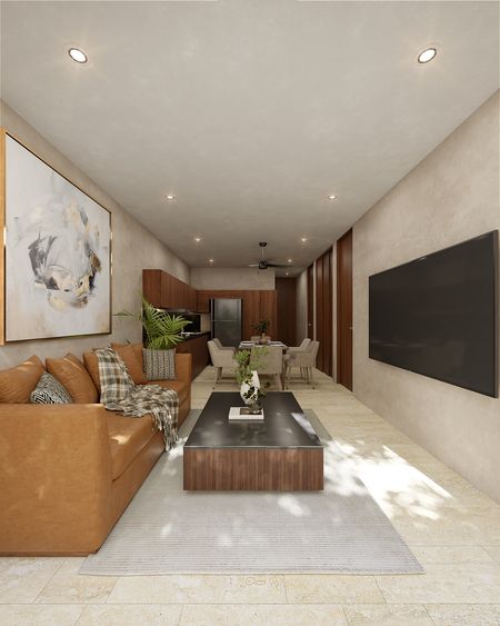 Los departamentos cuentan con acabados de lujo, incluyendo pisos de mármol travertino, mesetas de granito en la cocina y mármol en los baños, carpintería de alta calidad y preparación para aire acondicionado.
