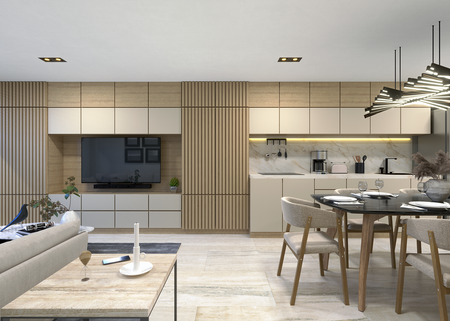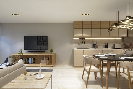 Este hermoso R1 de 46–47 m² combina diseño inteligente con acabados modernos para ofrecerte un ambiente funcional y acogedor: 1 habitación estilo loft