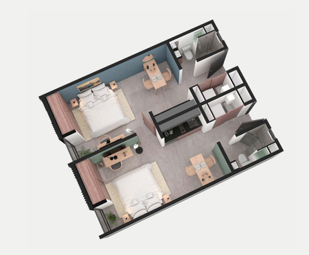 2 lofts con cocina equipada, baño completo, barra desayunador, área de lavado, los de PB. con terraza. Estacionamiento un auto.