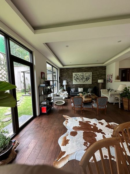 Preciosa casa en venta Lomas Country, muy buena ubicación cerca de la entrada del fraccionamiento, con excelentes espacios, domo de luz natural, amplia sala comedor con salida al jardín de 350 m2, oficina, medio baño de visitas, amplio family o 4a. recámara con baño completo, cocina integral, desayunador y área de T.V. con salida al jardín y terraza con asador.