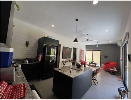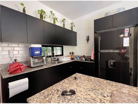 La cocina integral con barra e isla de granito y mesa comedor de cantera natural y parrilla electrica.