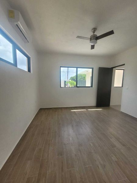 Recámara principal amplia con closet vestidor, baño completo con dos lavabos, aire acondicionado y ventilador de techo.