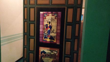 Ventanería con dibujos calados chinos en la entrada principal.