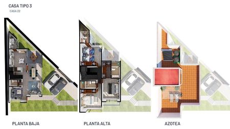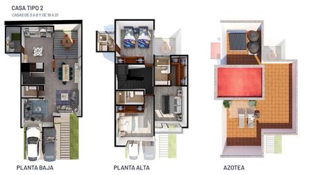 Casas con terrenos desde 151 m2 hasta 205 m2 y construcciones desde 193 m2 hasta 209 m2, jardines desde 36 m2 hasta 64 m2, 2 o 3 estacionamientos.