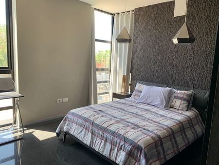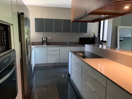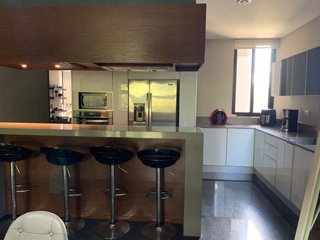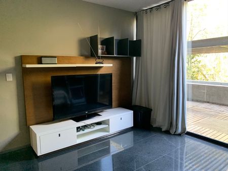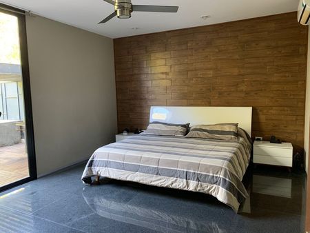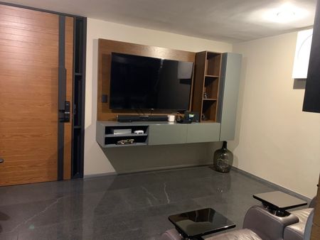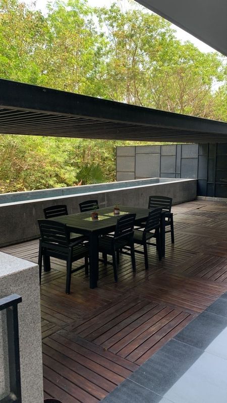 3 recamaras, 3 baños, cuarto de servicio con baño, área de TV, sala, comedor y cocina completamente equipada, terraza súper amplia con alberca privada, el departamento se encuentra en el 1er piso.