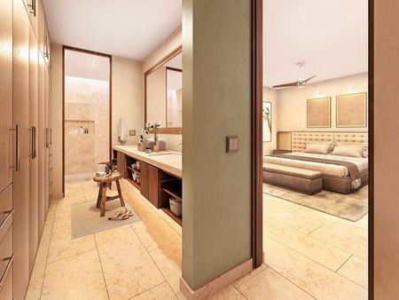 Recámara principal con área de clóset vestidor, baño completo y balcón.