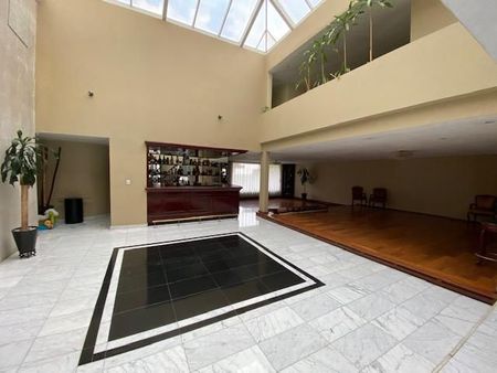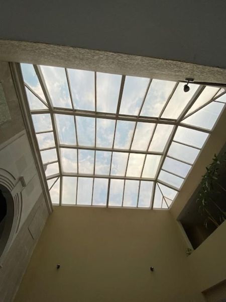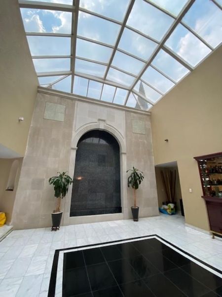 Gran vestíbulo de entrada de doble altura con fuente interior, mucha luz.
