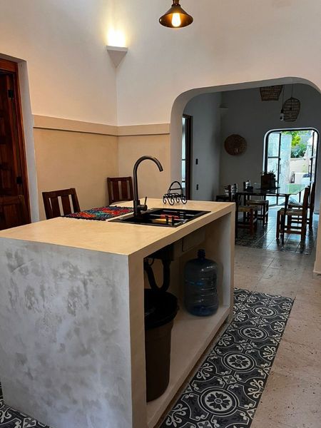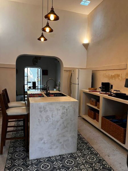 Cocina equipada con estufa de inducción eléctrica, tarja de acero inoxidable de buen tamaño, espacios de almacenamiento vestidos, isla desayunador con terminaciones en chukum y pasta!