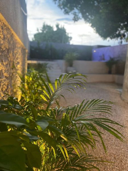 Jardín con salidas de agua y la captación de agua potable a uno de los tinacos en él área donde se localiza las plantas, maceteros y gravilla anti maleza en el área de piscina