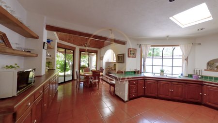En la planta baja, un luminoso recibidor da la bienvenida, seguido de una amplia cocina con desayunador, área de lavado, cuarto de servicio, y bodega. Dispone de una amplia sala con chimenea y comedor con vista al jardín. Además, encontrarás dos recámaras con baño completo y clóset, una con tapanco. El estudio conecta con las recámaras y la sala de TV con la recámara principal, que cuenta con vestidor, baño completo y acceso a jacuzzi.