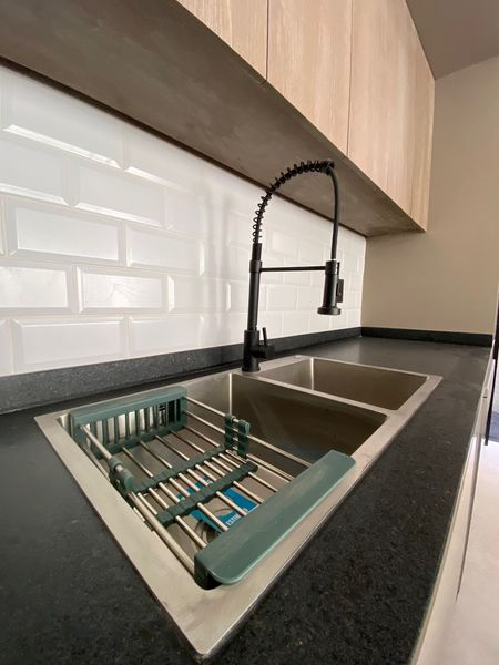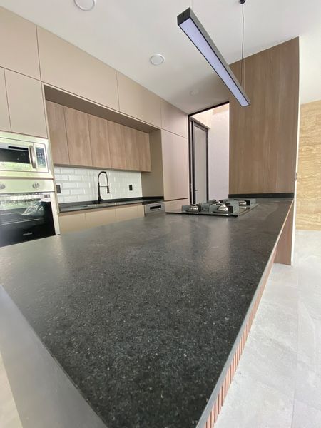 •Cocina equipada con campana de acero inoxidable, estufa, horno, despensa, puertas para almacenar, barras de granito, e isla desayunadora con espacio para bancos y almacenamiento.