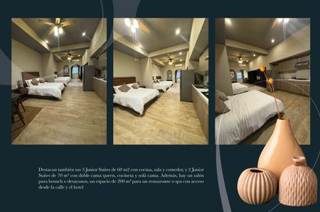 Destacan también sus 3 Junior Suites de 60 m² con cocina, sala y comedor, y 2 Junior Suites de 70 m² con doble cama queen, cocineta y sofá cama. Además, hay un salón para brunch o desayunos, un espacio de 200 m² para un restaurante o spa con acceso desde la calle y el hotel, y 9 estacionamientos subterráneos.