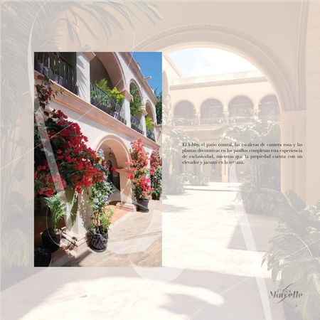 El lobby, el patio central, las escaleras de cantera rosa y las plantas decorativas en los pasillos completan esta experiencia de exclusividad, mientras que la propiedad cuenta con un elevador y jacuzzi en la terraza.