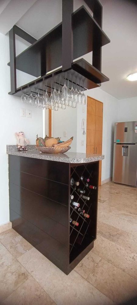 - La cocina y comedor tiene en medio un barra bar con granito y copero, con porta botellas tipo cava.