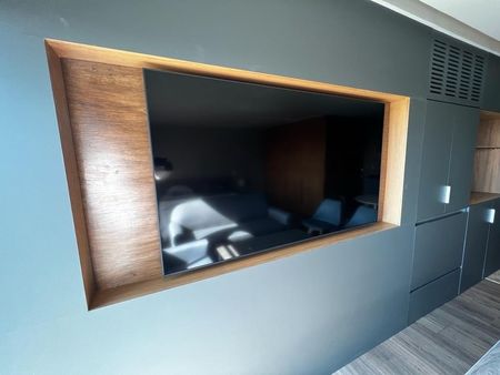 Una recámara con balcón, baño completo, sala, comedor, Aire acondicionado, TV 70”, centro de lavado, libreros y closets amplios, ropa de cama, y toallas.