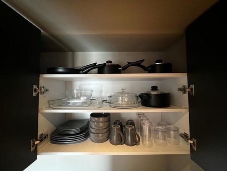 Cocina equipada con horno, estufa, microondas, refrigerador, vajilla completa, cubiertos, manteles, Bateria de cocina trapos.