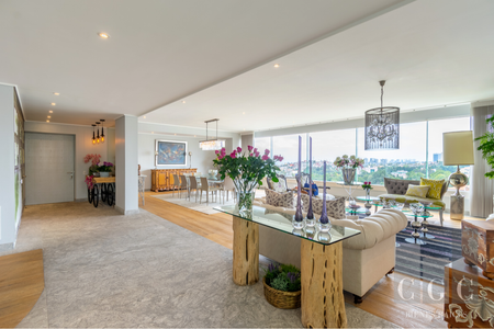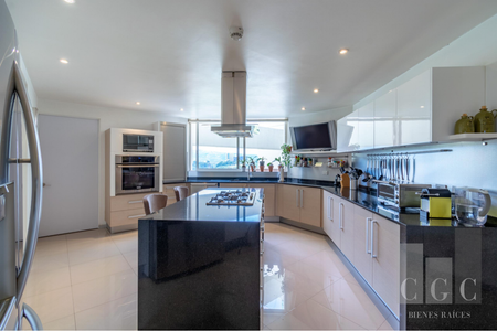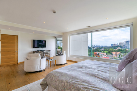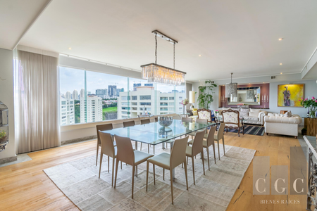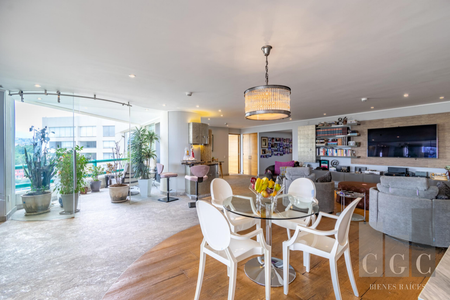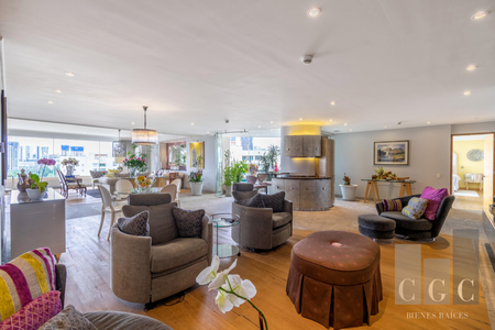 Ya sea que quieras leer o conversar en la sala, teniendo de frente una vista impresionante del horizonte o que salgas al balcón que se integra a la sala, disfrutarás de las amplias ventanas en cada habitación que iluminan todo el espacio. La terraza envolvente da tanto a áreas sociales como al cuarto de TV.