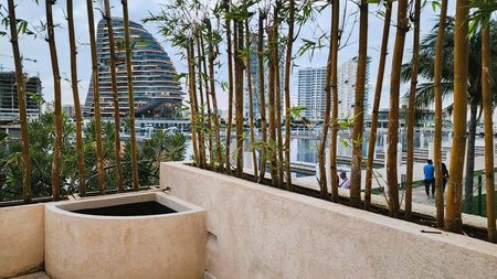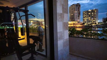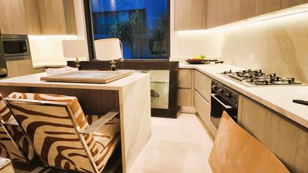 La cocina, con mobiliario de vanguardia, se complementa con una sala y comedor que se abren mediante grandes ventanales hacia una terraza techada con vistas panorámicas de la marina de Puerto Cancún.