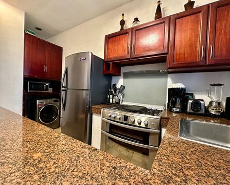 Este departamento muy bien ubicado y totalmente equipado cuenta además con 2 baños completos, sala, cocina, comedor y una terraza. Tiene lavadora y secadora y también cuenta con servicio de internet.