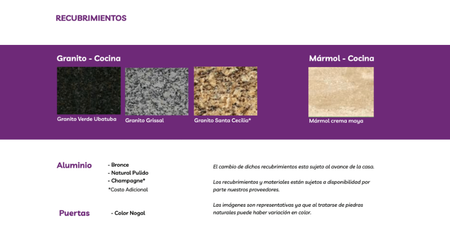 A escoger recubrimientos de granitos en cocina entre: Granito verde ubatuba, granito grissal y grantito santa Cecilia.