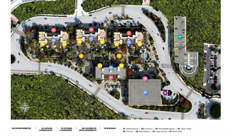 El proyecto tiene 63 locales comerciales distribuidos en la planta baja de cada uno de los cinco edificios del Desarrollo; cada una de las unidades tienen vista directa al jardín central o a la vialidad exterior que rodea el terreno.