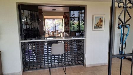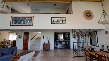 Sala y comedor amplios con techo de doble altura y tragaluz de policarbonato que deja entrar muchísima luz y una vista impresionante del valle y los volcanes.