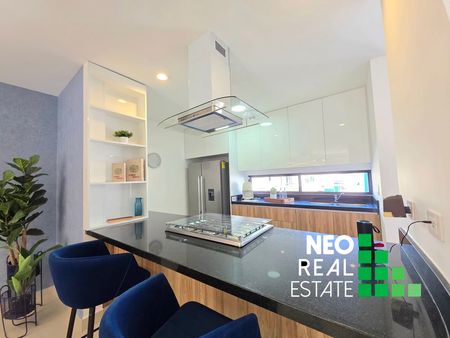 Cocina esquipada con estufa y barra de granito