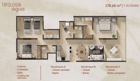 Las presentes representaciones gráficas son para efectos meramente ilustrativos, por lo que podrán estar sujetos a variación con el producto final. Los elementos mobiliarios representados no se encuentran incluidos. Así mismo el equipamiento será solamente el especificado en la memoria de acabados y equipamiento.
