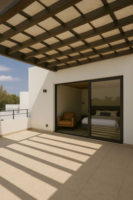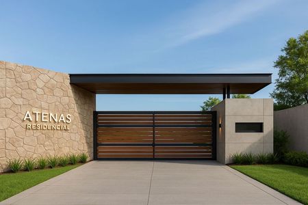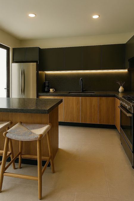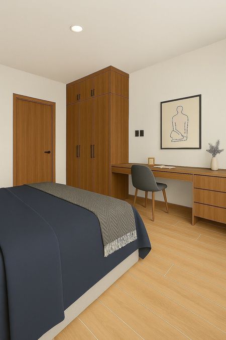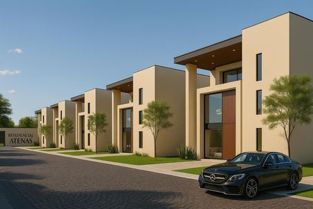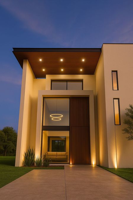 Residencia de estilo contemporáneo con fachada moderna que destaca por su diseño de líneas limpias, ventanales amplios y un acceso principal en doble altura con puerta de madera, enmarcado por iluminación arquitectónica y plafón de acabado en madera. Esta combinación aporta un carácter elegante, minimalista y funcional.