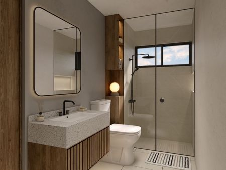Calentador y parrilla eléctrica de 2 o 4 quemadores, meseta de granito blanco en cocina, gavetas inferior es en cocina, meseta de mármol en baño, closets semi vestidos, cancelería con cristal templado en baño.