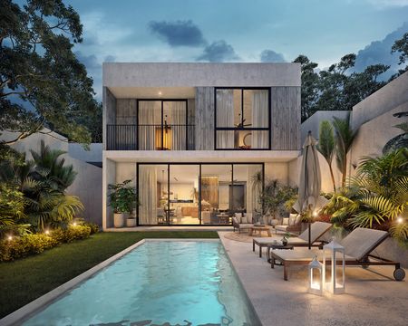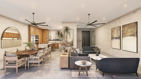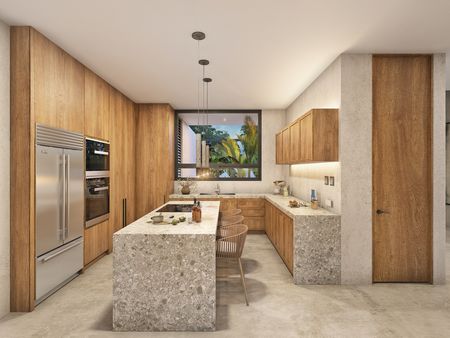 -En planta baja, la sala, comedor y cocina abierta se conectan con la terraza y la piscina, creando un ambiente ideal para convivir.
