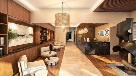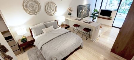 Estudio con balcón, baño completo, sala-comedor, cocina equipada, barra desayunador.