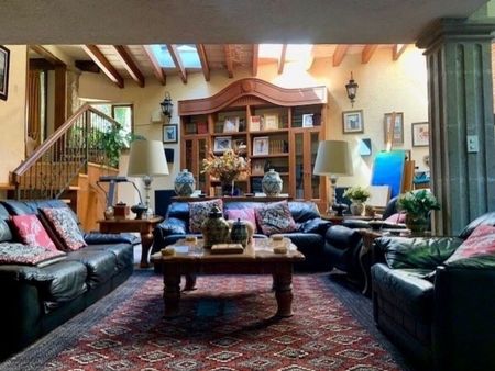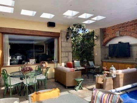 Espectacular casa con 950 metros de terreno y 1,000 metros de construcción, Proyecto del reconocido arquitecto Almanza, Súper iluminada, Muy cómoda y acogedora, Construida en medios niveles, Techos altos, Pisos de madera con mármol martelinado, Alberca y jacuzzi techada con asoleadero, área de asador y acceso al jardín, Jardín arbolado con fuente, Hermoso vestíbulo, Sala con chimenea y vista hacia el jardín, Salita con bar y tapanco para un pequeño despacho junto a la sala principal, Comedor con salón de estar independientes con vista y acceso directo a la alberca, Baño de visitas, Cocina integral con barra para desayunador, pantry y gran alacena, Antecomedor con Family Room, Salón de juegos con bar y medio baño, Despacho con closet para papelería, Cuarto para gimnasio, Cuatro recámaras, todas con baño, vestidor y salita de estar cada una, La principal con chimenea, sauna en el baño y dos grandes vestidores, Cuarto de servicio con espacio para cuatro camas y baño privado, Área de lavado y tendido con baño completo adicional, Estacionamiento para ocho autos techado con closet para herramientas, Dos excelentes bodegas, La casa cuenta con calefacción, sistema de aire lavado, gran cisterna, calentador de agua triple y circuito cerrado de seguridad, Magnifica opción¡