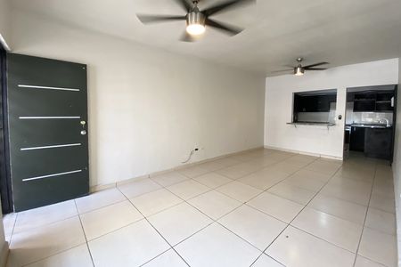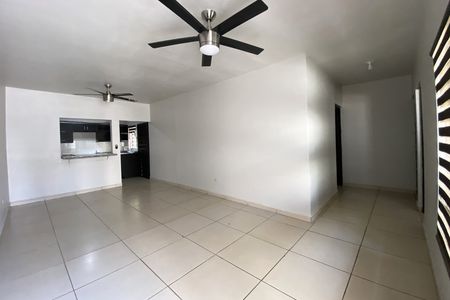 De un piso, con cochera para un auto, espacio de sala, comedor, cocina con estufa y refrigerador, lavandería semi-techada, medio baño, recamara principal con baño completo y minisplit, recamara secundaria con baño completo y minisplit, en sala-comedor con abanicos de techo.