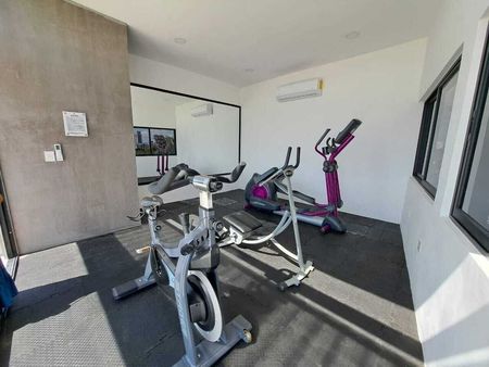 Pequeño gimnasio con aire acondicionado, bicicletas y elíptica.
