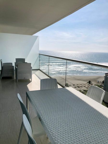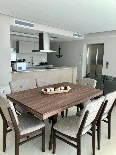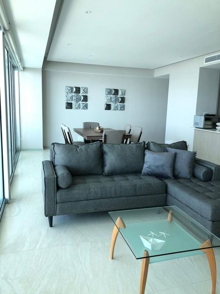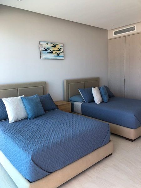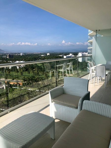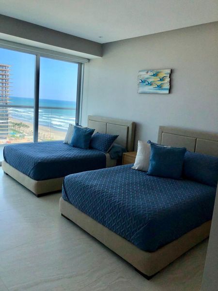 Increíble departamento frente al mar en Velera Acapulco Diamante, Departamento para 6 personas, tiene 2 recamaras con baño, la principal con cama king y la otra con 2 camas matrimoniales. Estancia sala, comedor y cocina equipada con todo lo necesario, 2 terrazas con vista al mar y al campo de golf. 1 con sala y mesa para 6 personas.