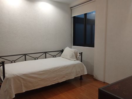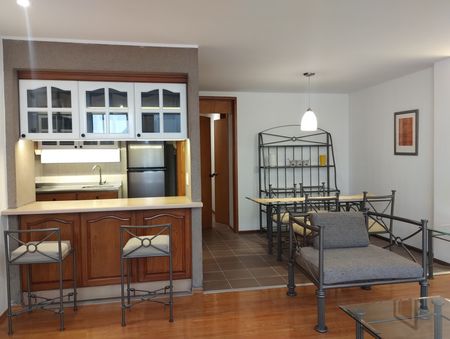 Departamento en primer piso, totalmente amueblado, 85 M2, 2 recámaras, principal con baño y terraza, otro baño completo, sala comedor, cocina. Estacionamiento para 1 auto, portero y CCTV.